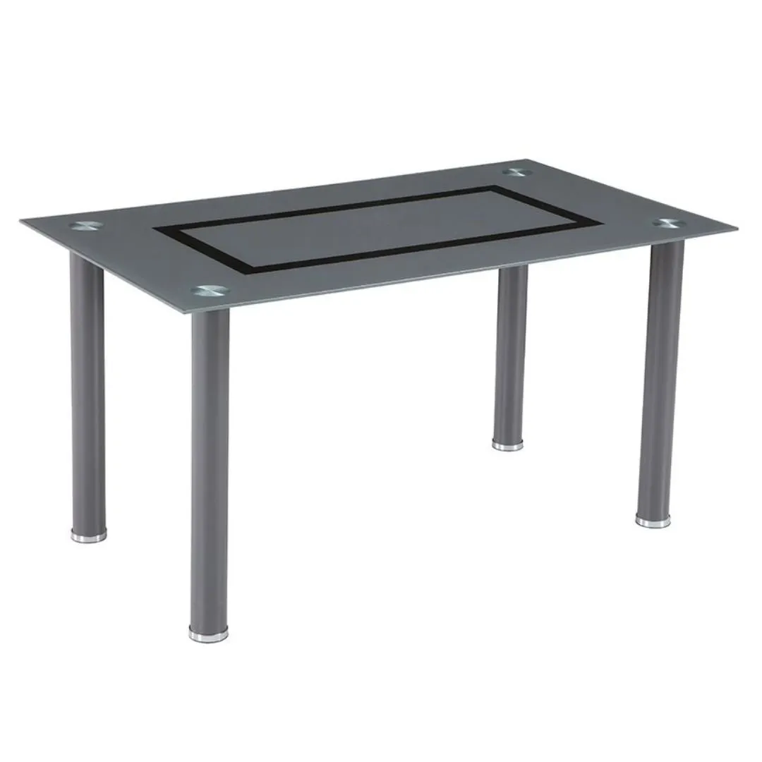 Esta mesa de cristal para comedores te ofrece un espacio seguro para su uso diario. Todo ello, con un diseño cuadriculado en tonalidad grisácea que sobre sale por su lineal interior en color negro y patas de acero. Ideal para todo tipo de espacios.