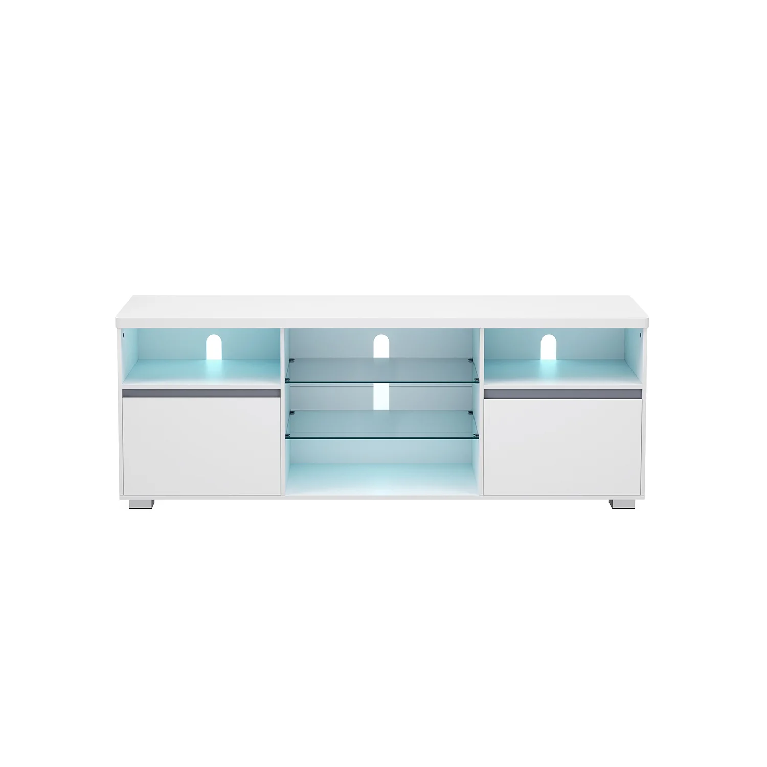 VASAGLE Mueble TV con Luces LED, Mesa de TV Moderna para Televisión hasta 70 Pulgadas, Estantes de Vidrio Abiertos, 2 Compartimentos con Puertas, 160 cm, Salón, Dormitorio, Blanco LTV331T10
