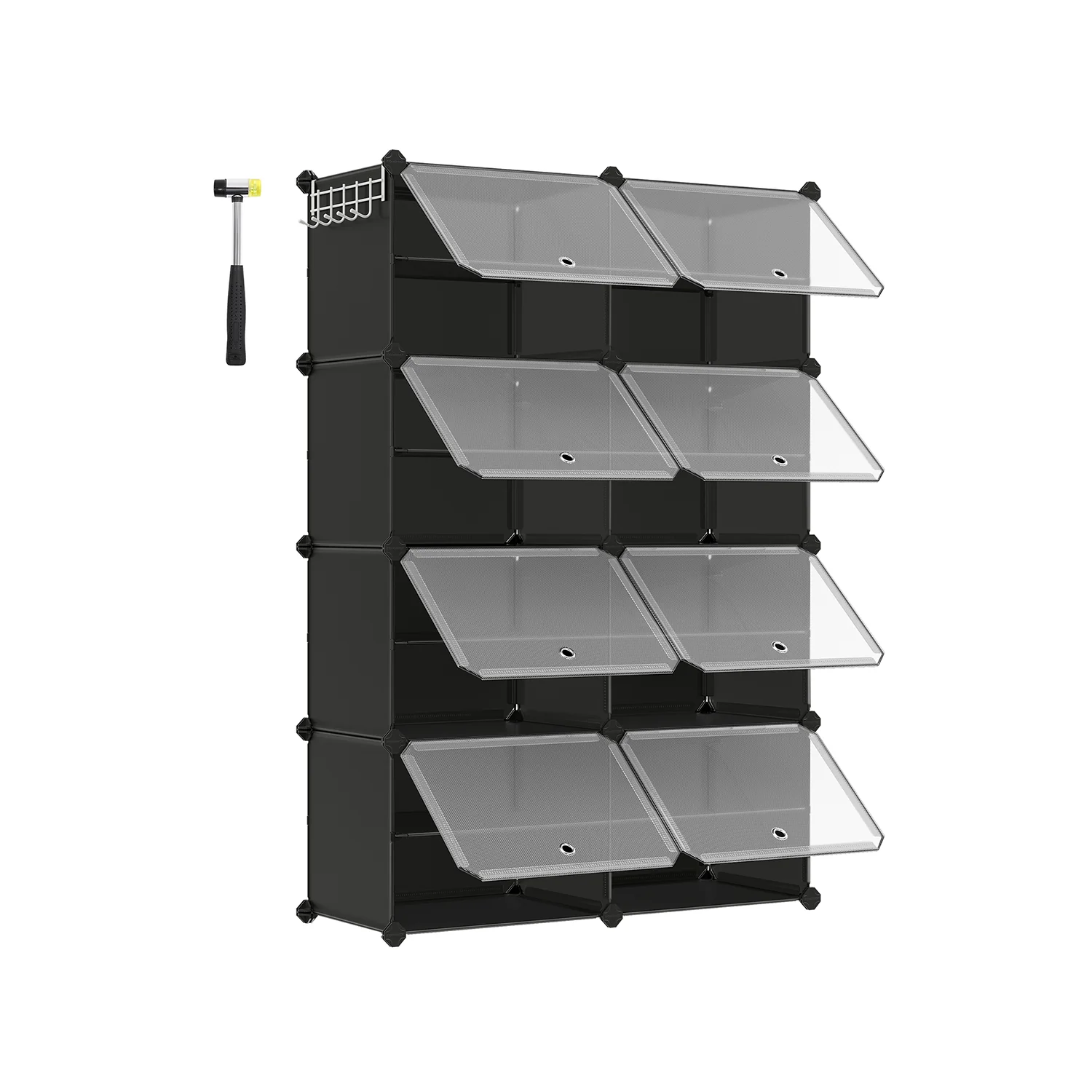 SONGMICS Mueble Zapatero Plástico, 8 Compartimentos, Zapatero Modular, Estantería Modular de Plástico, 30 x 40 x 30 cm Cada Cubo, con Puerta, Marco de Acero, Paneles de Plástico, Negro LPC034B01