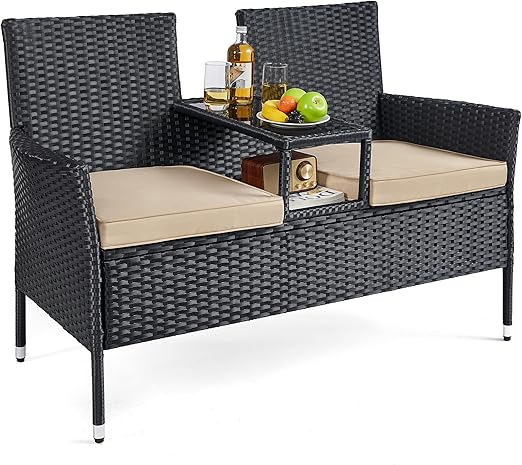 SONGMICS Muebles de jardín de jardín de polirratán de polietileno, banco de jardín con mesa, sofá, muebles de terraza, exterior, con cojín, para terraza, jardín, balcón, color negro y gris topo