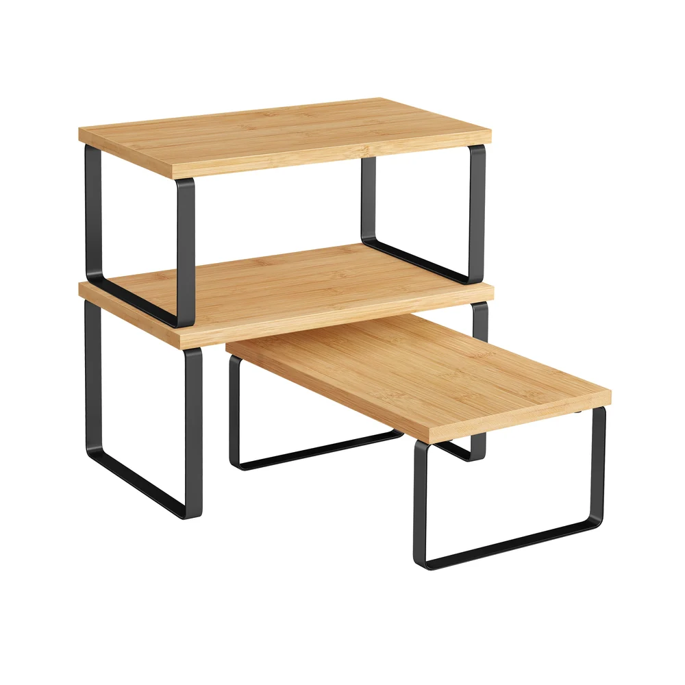 SONGMICS Estante para Especias, Juego de 3, Organizador de Armario, Apilables, Especieros Extensibles, Metal y Bambú, Negro Tinta y Beige Natural KCS014B01