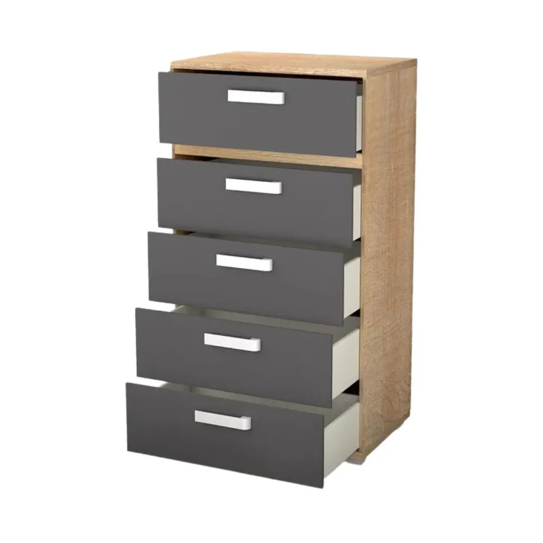 Un sinfonier con 5 cajones. Compuesto por materiales de gran calidad. Un tablero melaminado de gran resistencia con una combinación de herrajes metálicos y derivados del plástico. Los cajones van con guías metálicas. Está disponible exclusivamente en color cambria-grafito.