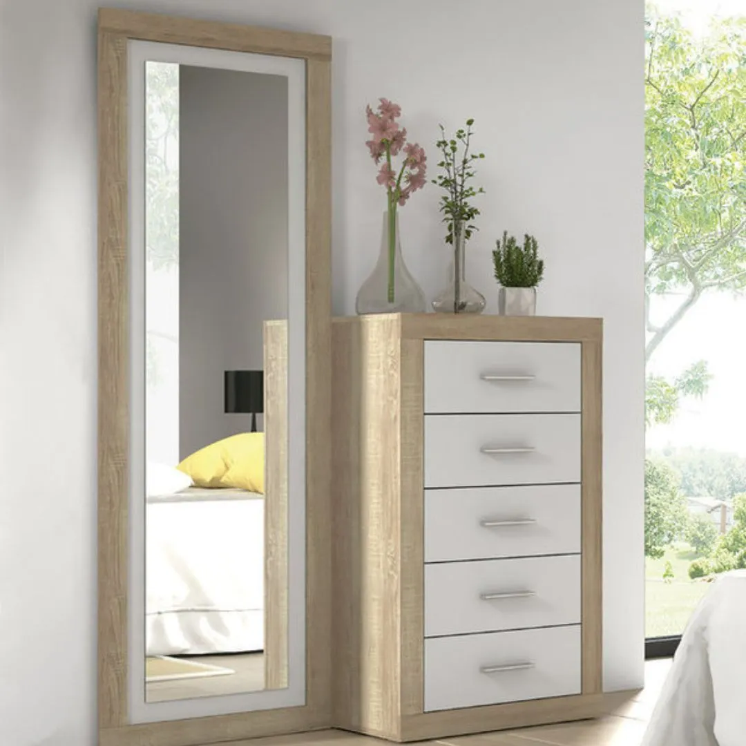 Un sinfonier con 5 cajones. Está compuesto por materiales de gran calidad. Un tablero melaminado de gran resistencia con una combinación de tiradores metálicos. Los cajones van con guías metálicas.