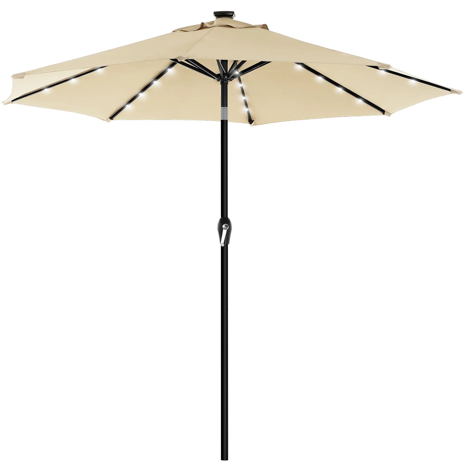 SONGMICS Parasol de jardín con Luces solares LED, Sombrilla Ø 2,7 m, Protección UPF50+, Inclinable, Manivela para Abrir/Cerrar, Base no incluida, Gris GPU040G01