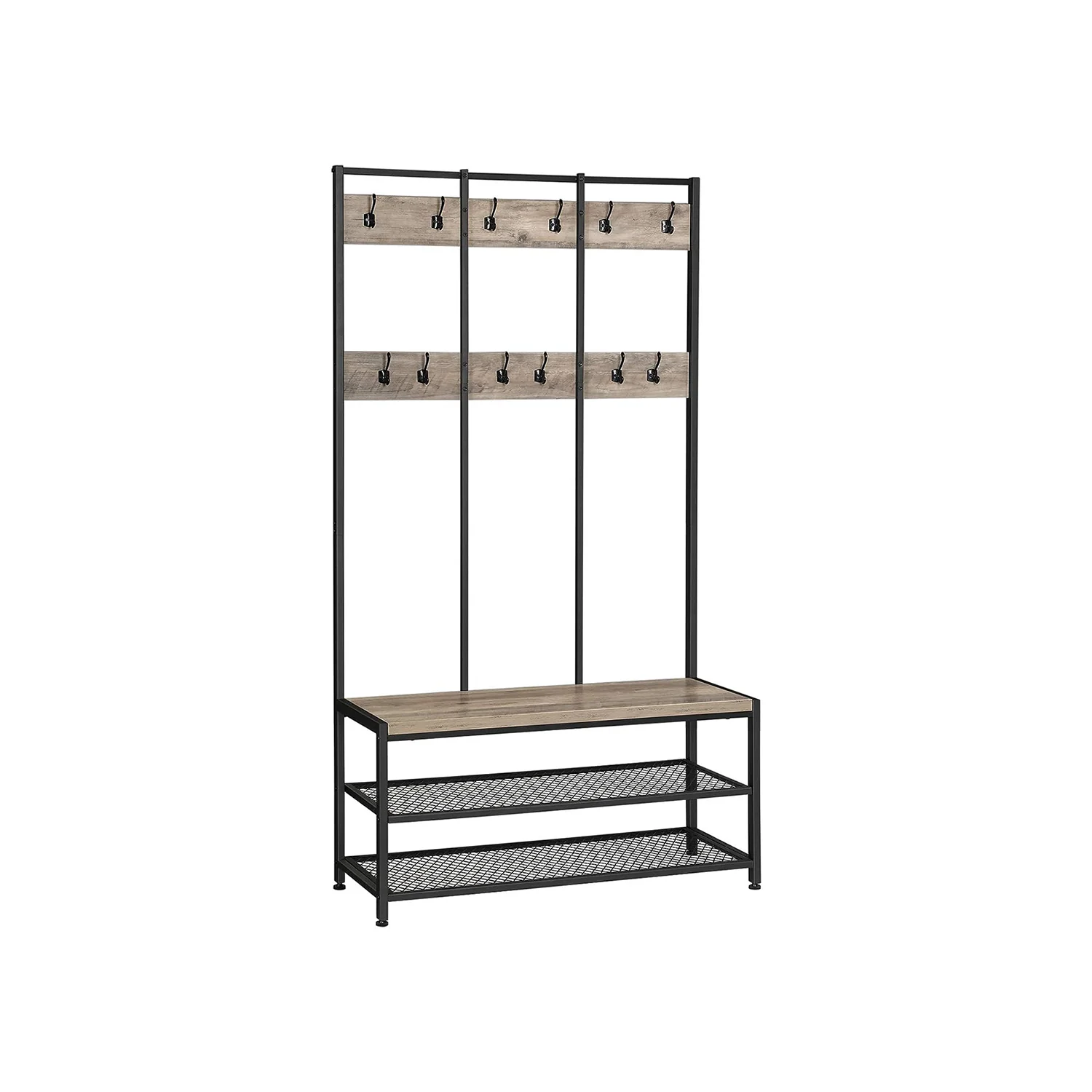VASAGLE Perchero con Banco de Zapatos, Diseño Industrial, con 12 Ganchos y Zapatero, Estante de Pasillo Multifuncional, Oficina, Dormitorio, Marco de Hierro Resistente HSR86BX
