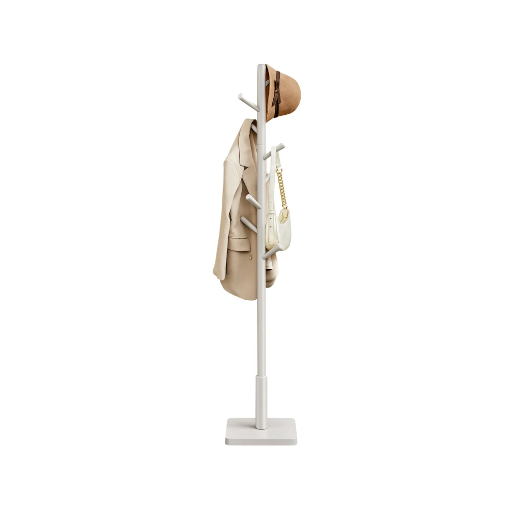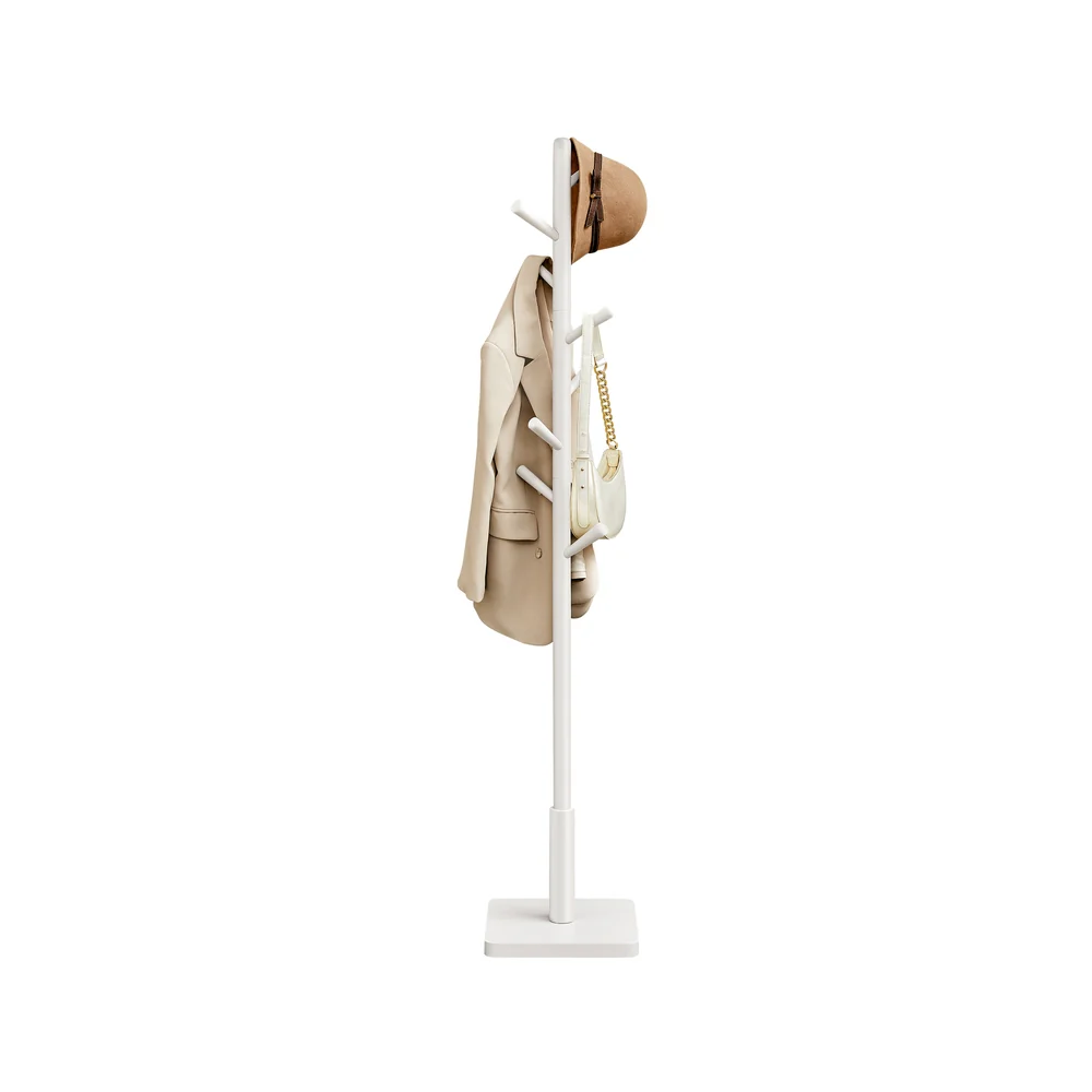 VASAGLE Perchero de Pie, Soporte para Abrigos de Madera Maciza, con 8 Ganchos para Sombreros, Bolsas, Monederos, para Entrada, Pasillo, Ganchos y Postes de Madera de Caucho, Blanco RCR010W02
