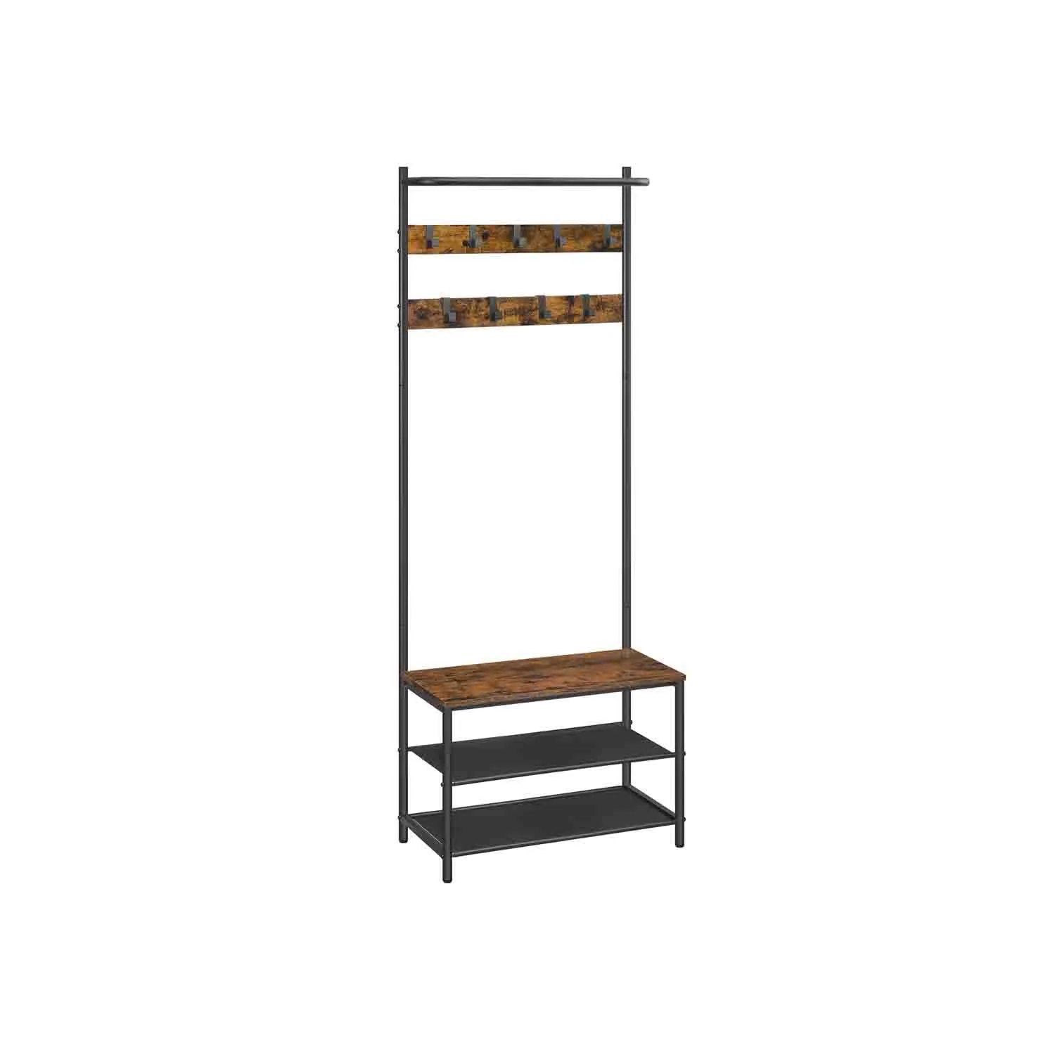 VASAGLE Perchero Zapatero, Perchero Recibidor, con Banco Zapatero, 9 Ganchos Extraíbles, Barra Superior, 32,2 x 84 x 180 cm, Entrada Dormitorio, Industrial