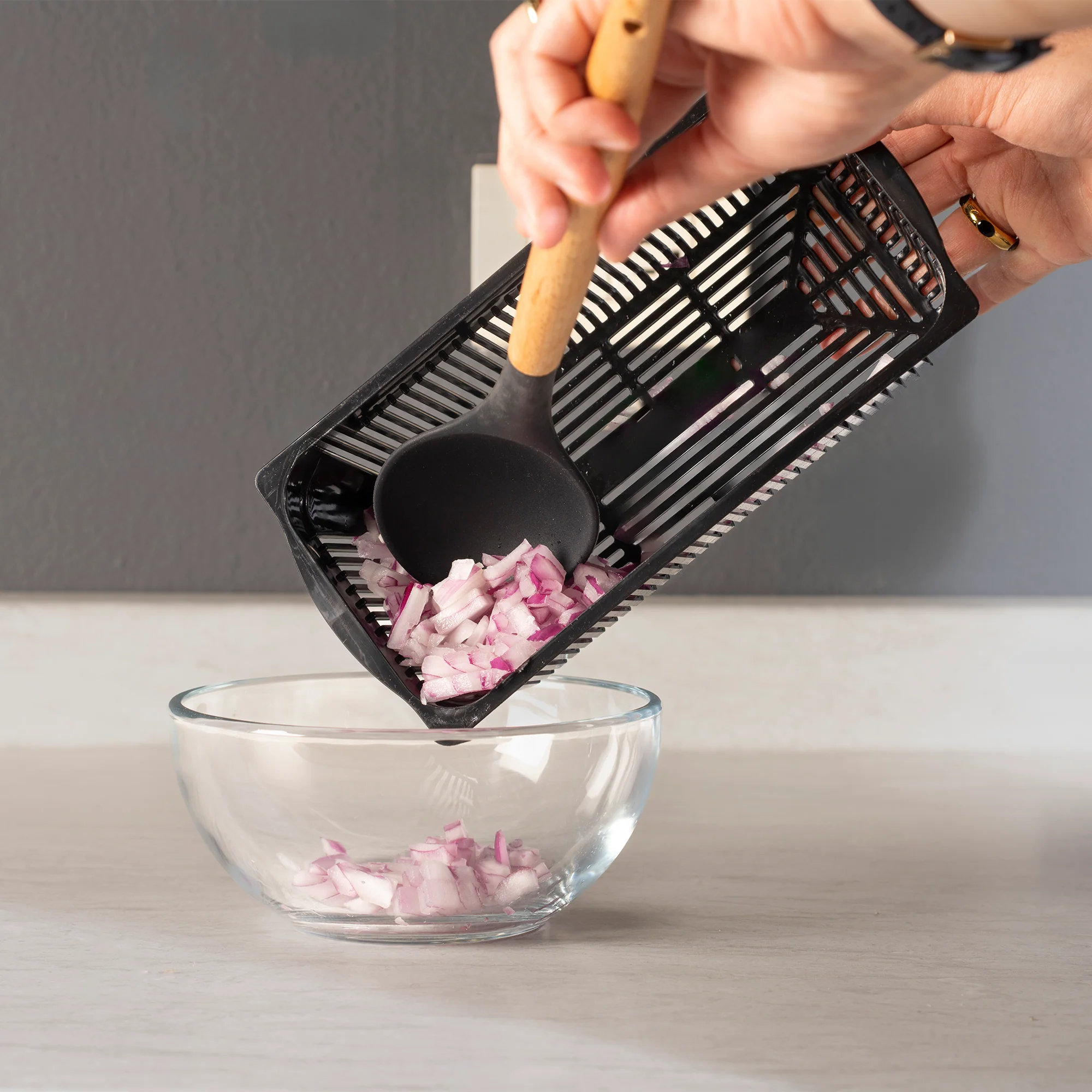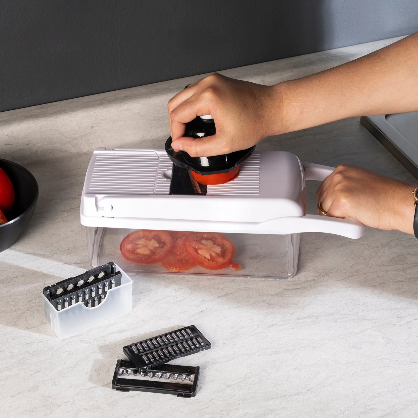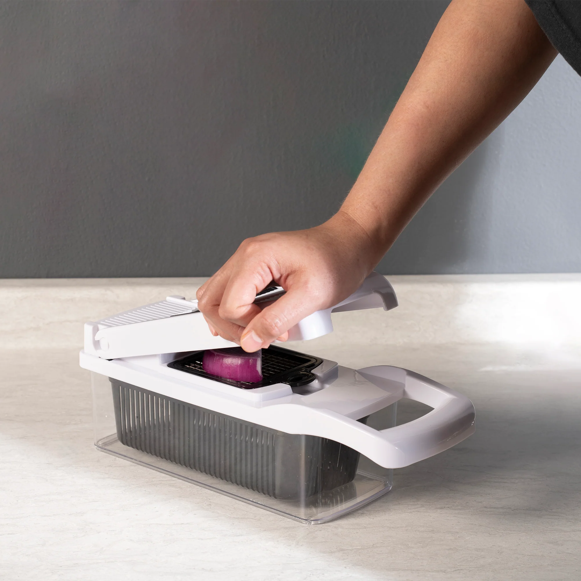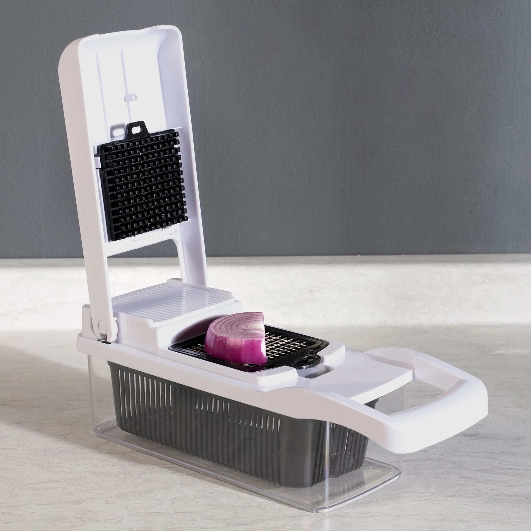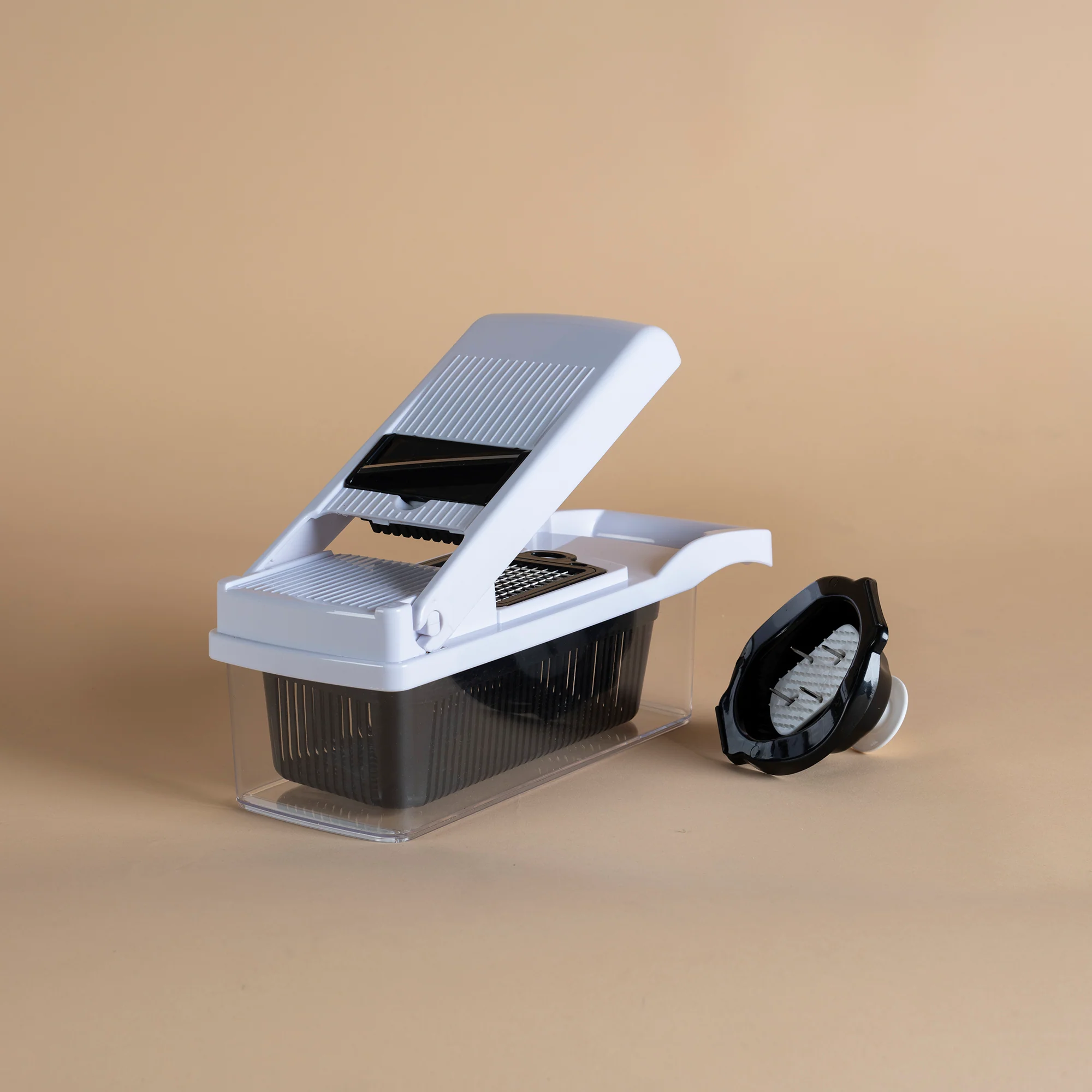 Picador via practic 13 e 1, ahorra tiempo y esfuerzo al cocinar, ideal para rebanar, cortar, picar y rallar, con cuchillas intercambiables.