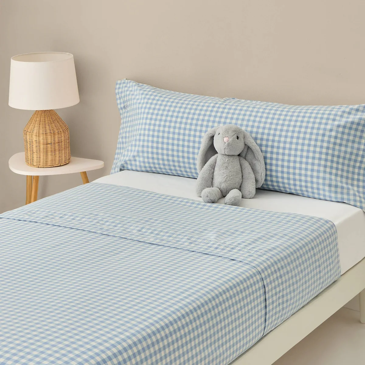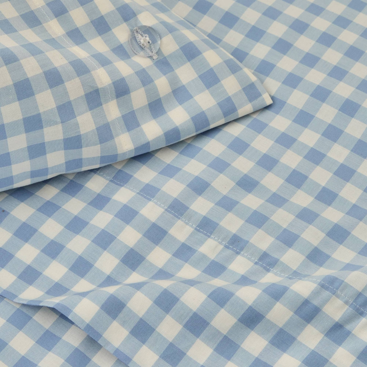 Set de sábana encimera y funda de almohada de algodón percal de 180 hilos, de hilo tintado formando cuadros vichy. La funda de almohada se cierra con botones y mide 45×110 cm.