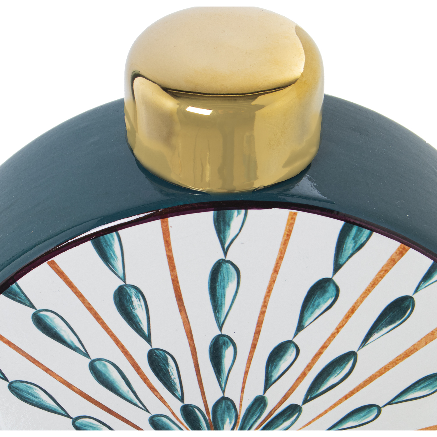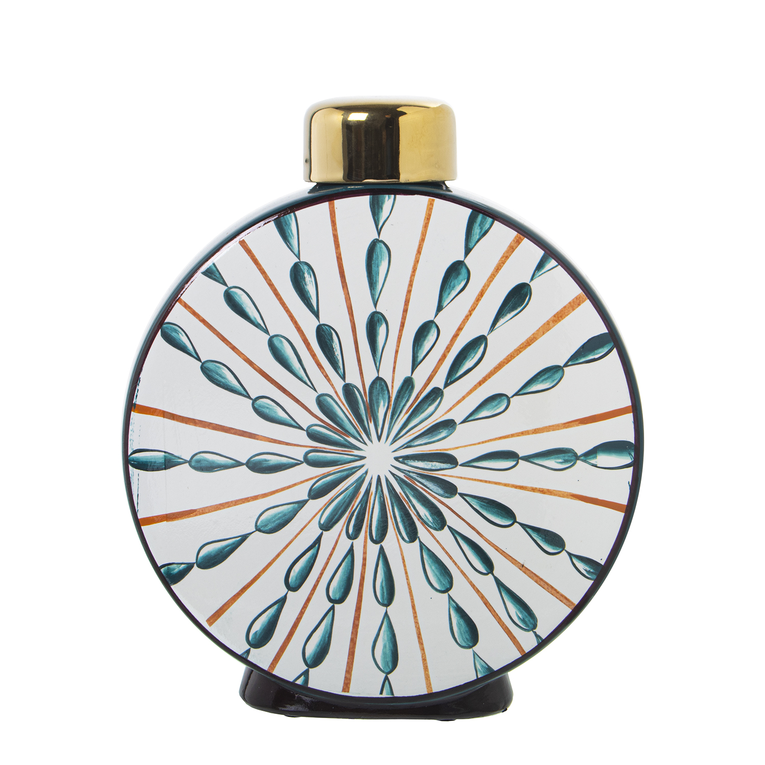 Tibor de cerámica redondo blanco y azul con tapadera dorada.