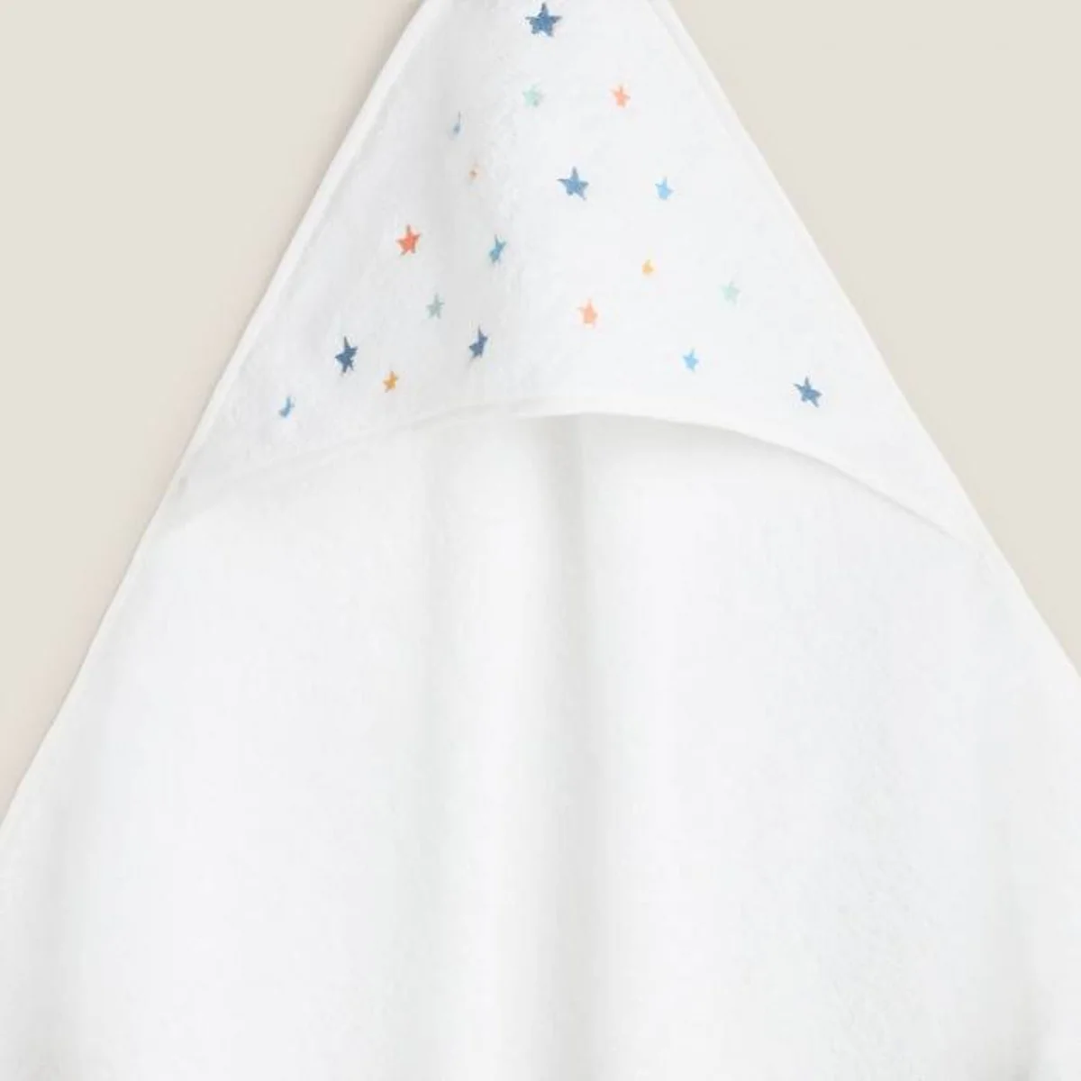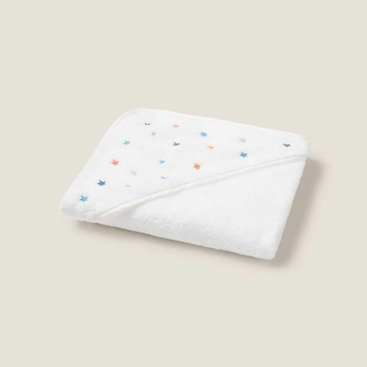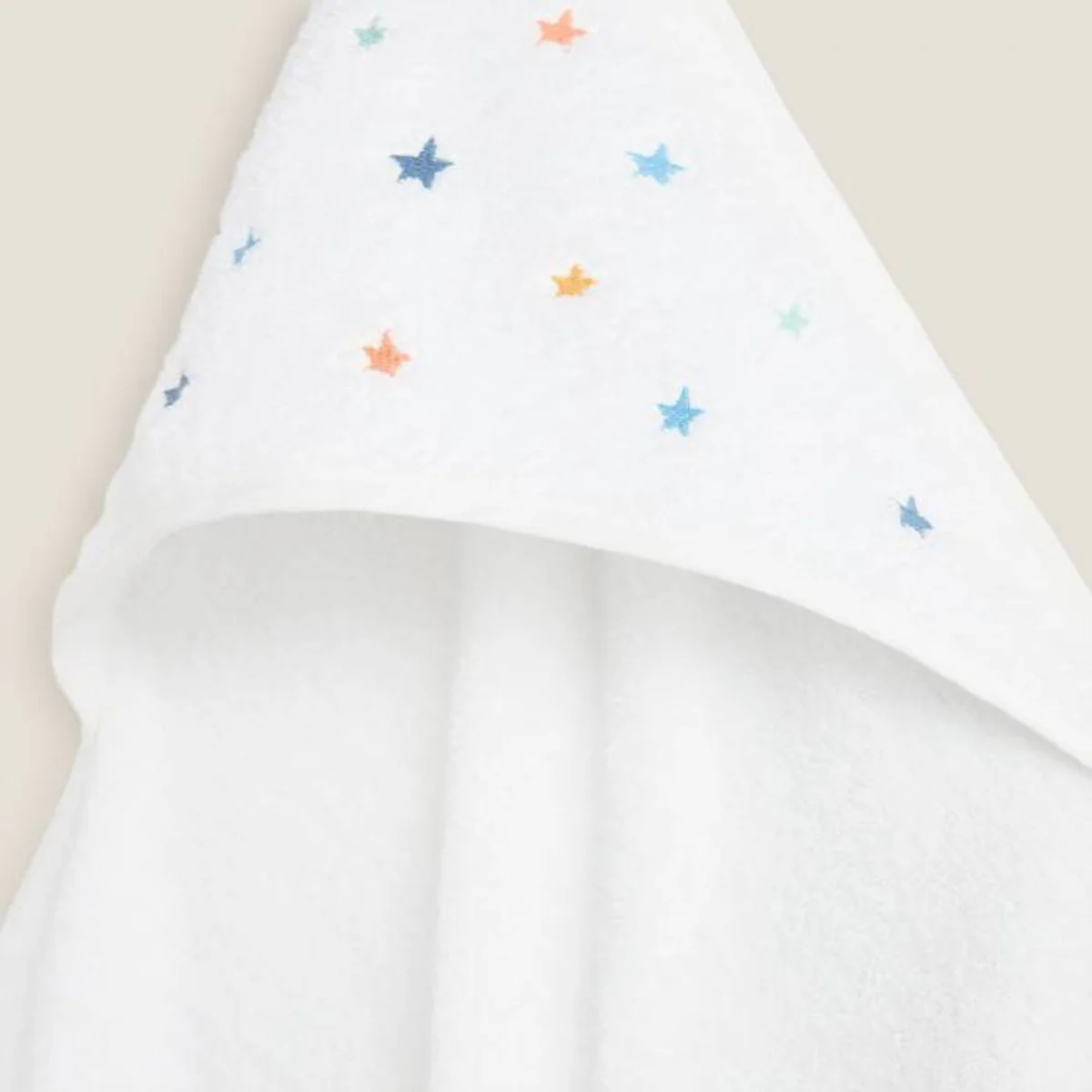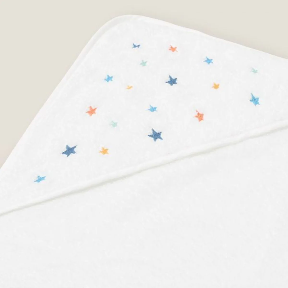 Toalla de baño de rizo de algodón de 400 g con capucha. Con bordado de estrellas en la capucha. Confeccionada en Portugal.