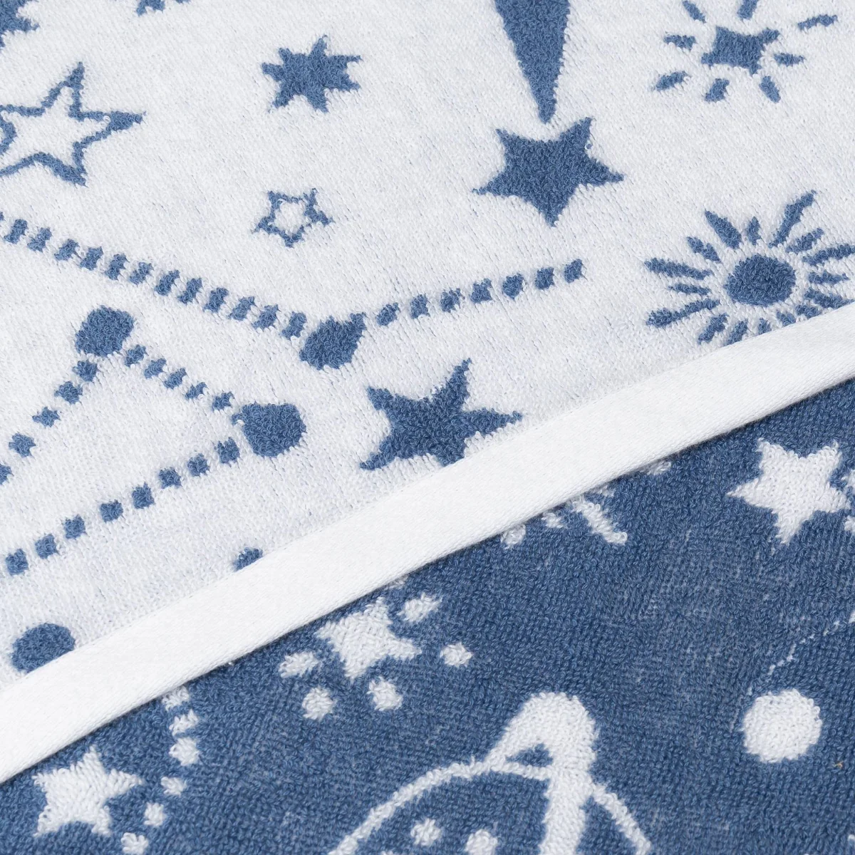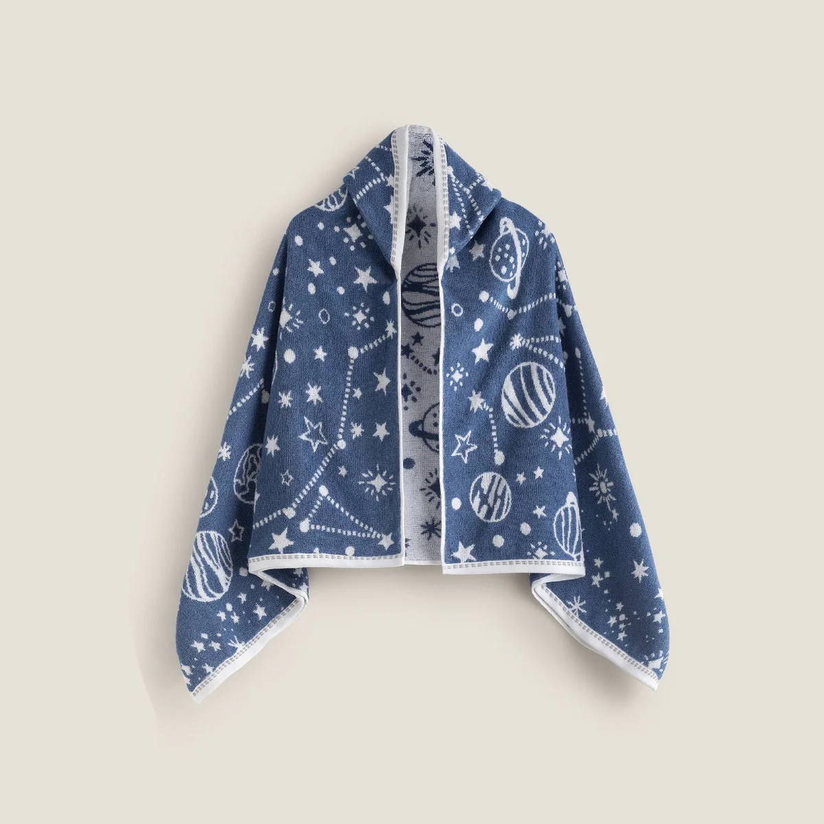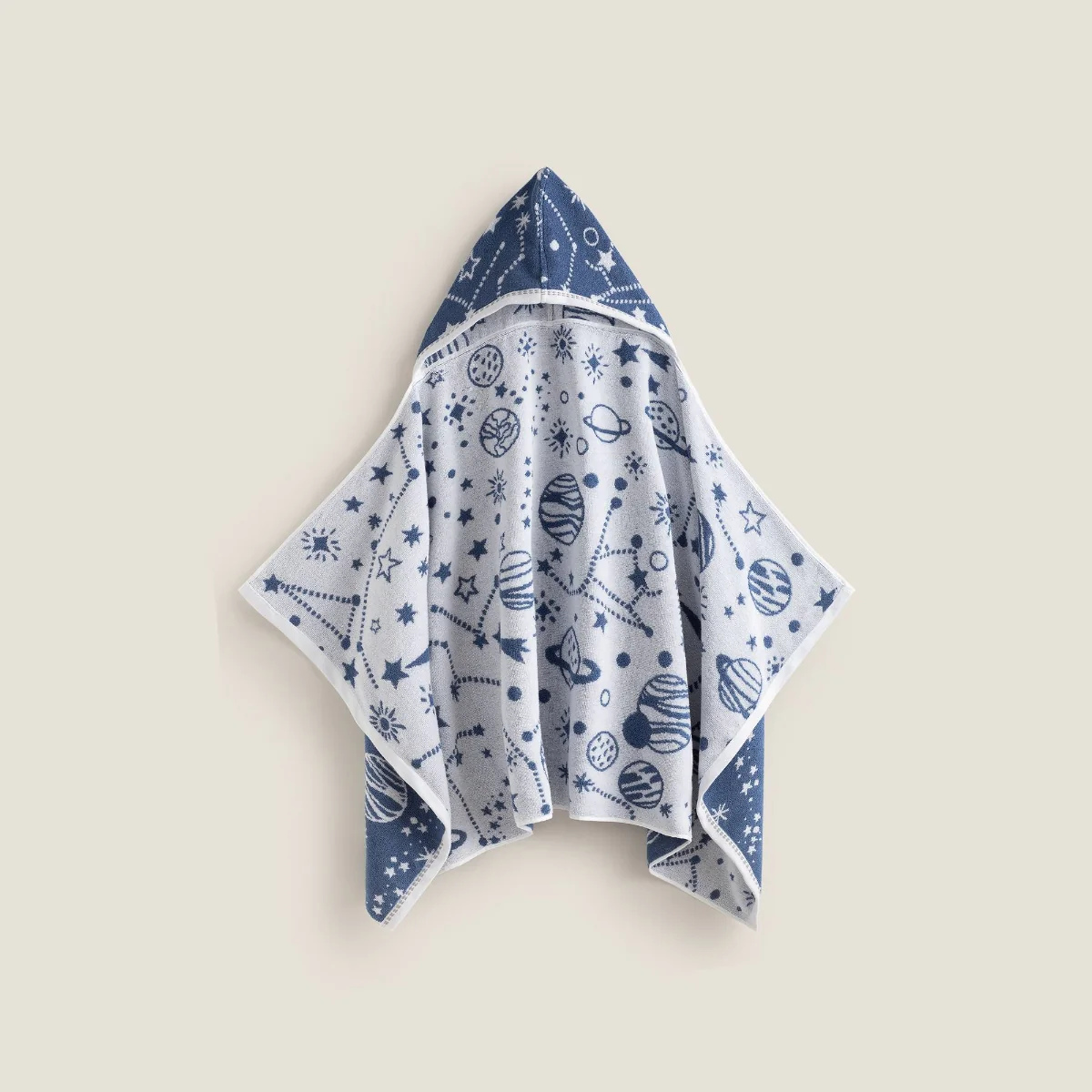 Toalla de rizo de algodón de 500 g con capucha. Motivo de planetas y estrellas realizado en Jacquard. Confeccionada en Portugal.