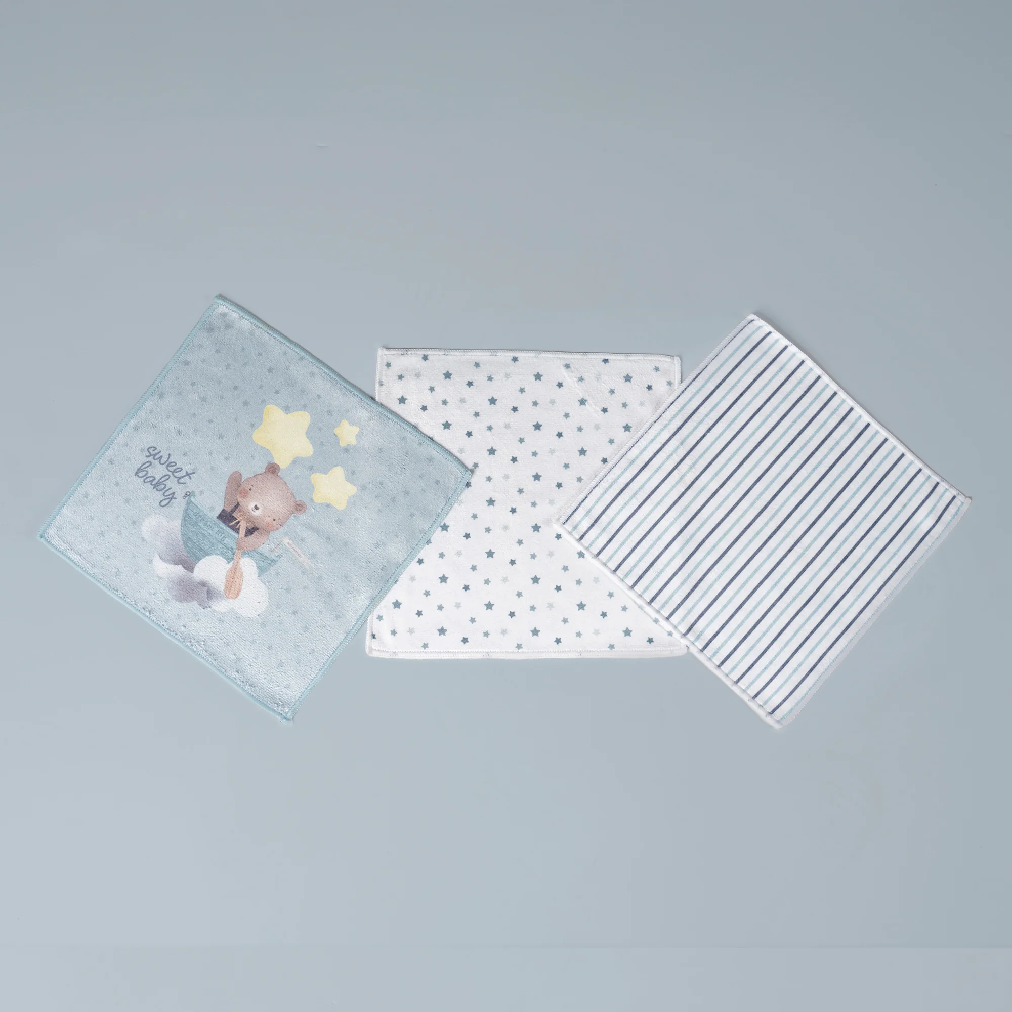 Juego de 3 toallitas faciales estampadas. Súper absorbentes, suaves al contacto con la piel de tu bebé. Ideales para llevar a todos lados.