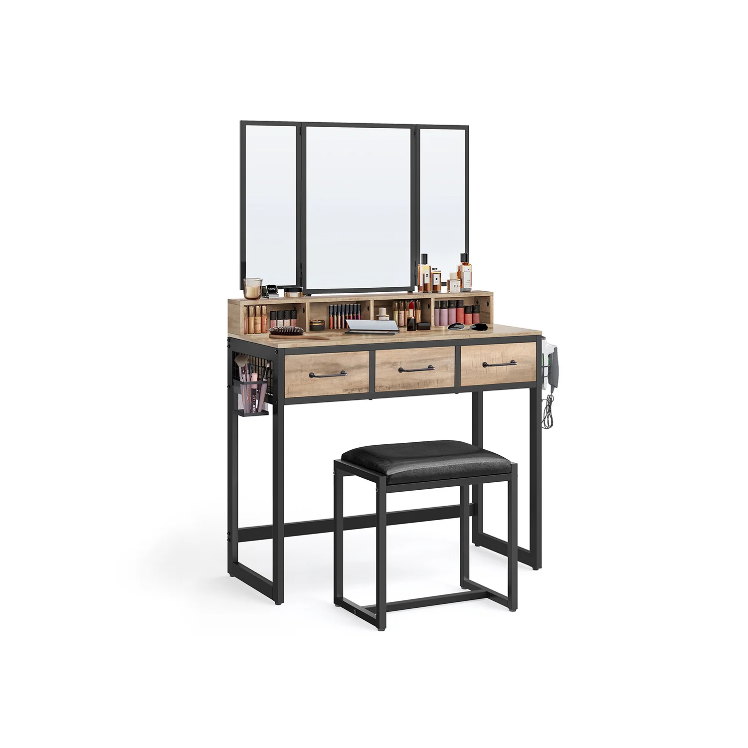VASAGLE Tocador con Taburete, Juego de Mesa de Maquillaje con Espejo Triple, 3 Cajones, con Estructura de Acero, Estilo Industrial, Marrón Rústico y Negro RVT004B01