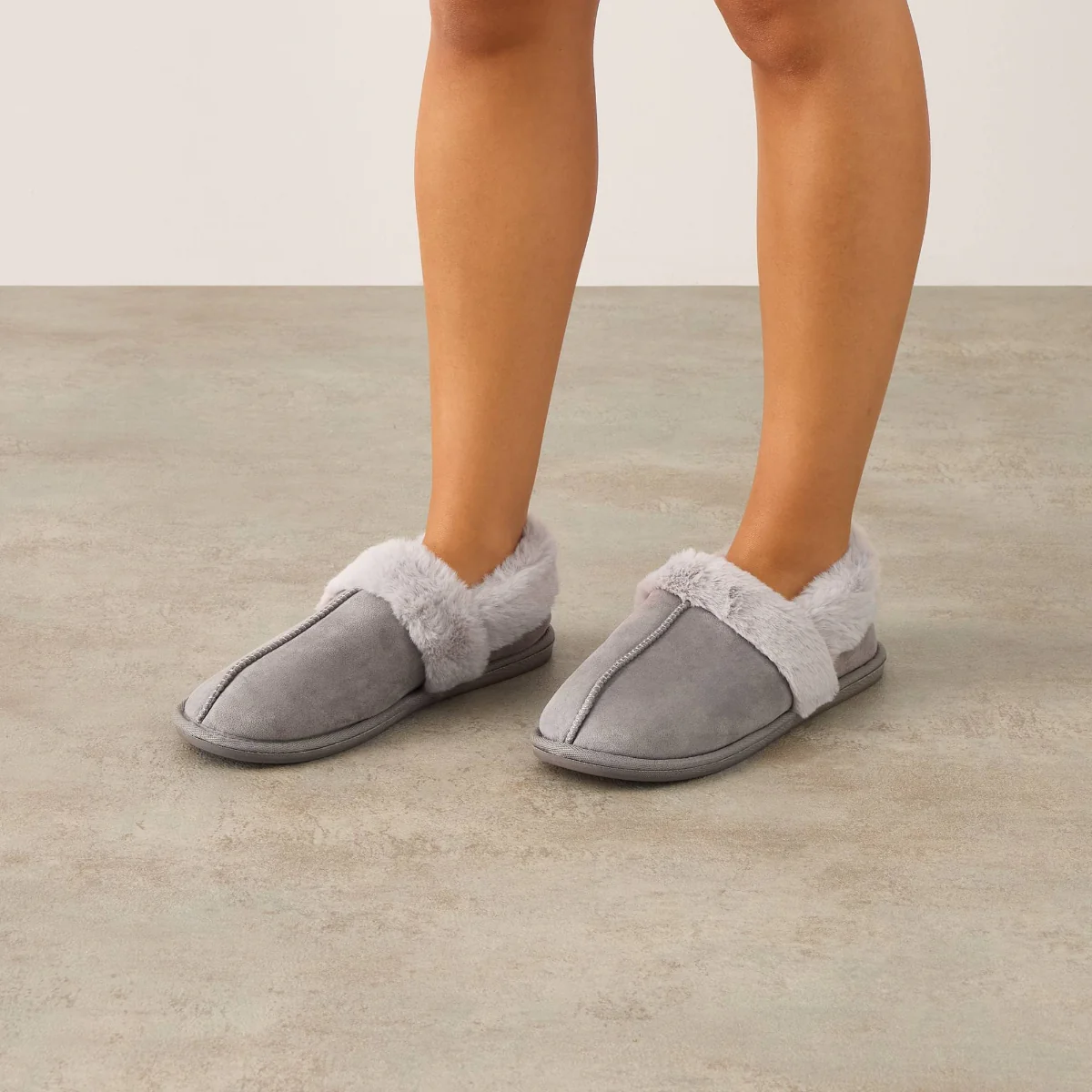 Zapatillas con exterior afelpado y forro interior de pelo muy suave. En tono gris, con vuelta envolvente que aporta mayor abrigo y suela ligera para un paso cómodo. Perfectas para relajarse en casa con una agradable sensación de confort diario.
